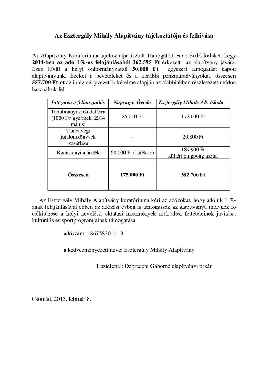 Esztergály Mihály Alapítvány tájékoztatója és felhívása