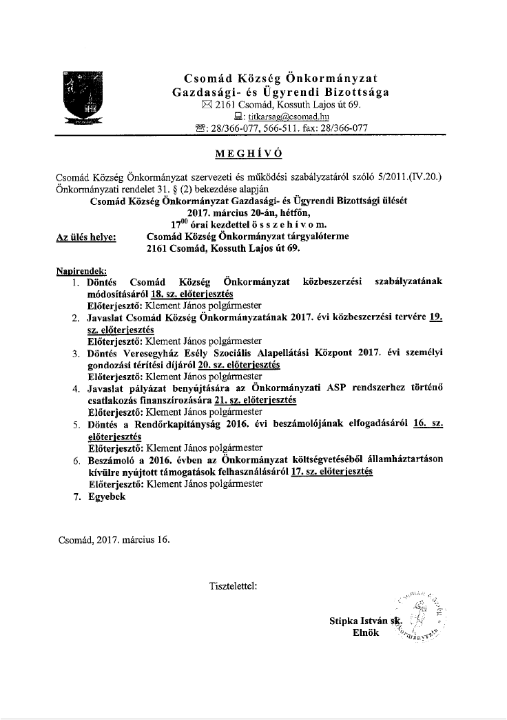 Meghívó Gazdasági-és Ügyrendi Bizottsági ülésre
