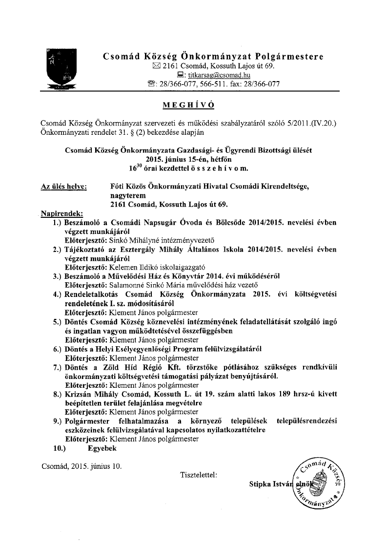 Meghívó Gazdasági-és Ügyrendi Bizottsági ülésre
