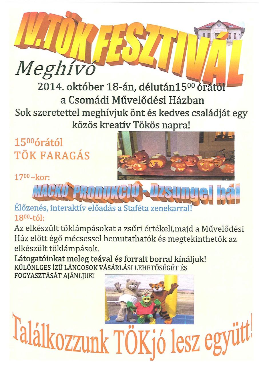 Sok szeretettel Meghívjuk önt és kedves családját egy közös kreatív Tökös napra 2014. október 18.-án,15:00 órától a Csomádi Művelődési Házba!
