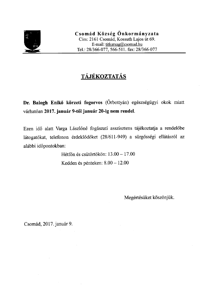Csomád Község Önkormányzata Cím: 2161 Csomád, Kossuth Lajos út 69. E-mail: titkarsag@csomad.hu Tel.: 28/366-077, 566-511. fax: 28/366-077 |