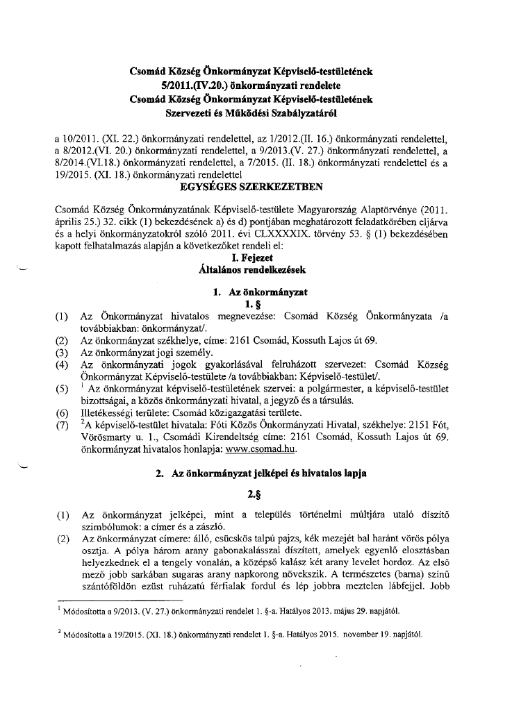 - 2011. évi 5. Csomád Község Önkormányzat Szervezeti és Működési Szabályzata egységes szerkezetben